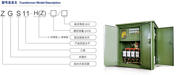ZGS11系列组合式变压器是一种新型配电设备(又称美式箱变),是将高压负荷开关、插入式熔断器、高压限流熔断器安装在变 压器油箱内,以矿物油进行绝缘和冷却,具有结构合理紧凑、体积小、安装灵活、操作方便、占地面积小等优点。组合式变压器特别适用于城市电网的 负荷中心,降低损耗,提高供电质量。